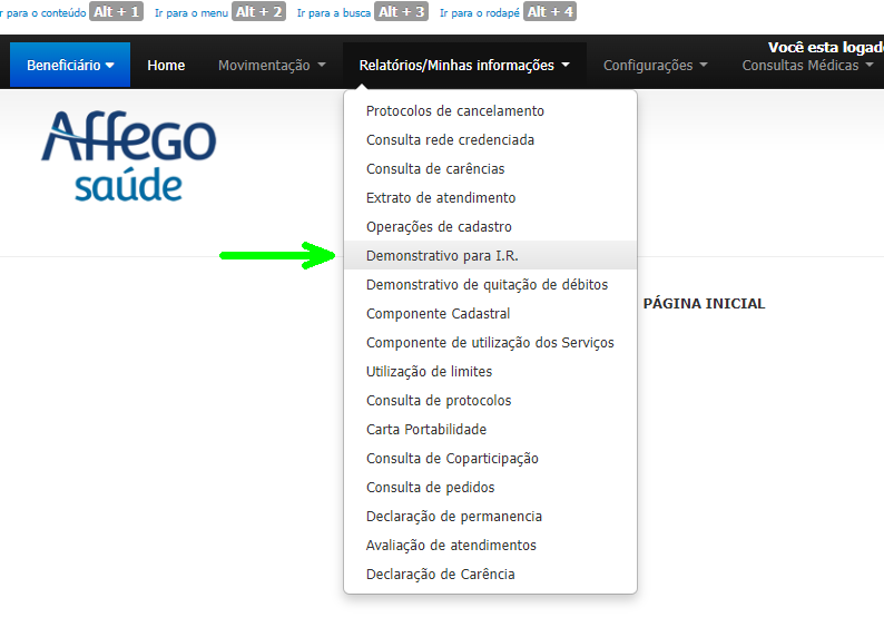 Faça seu login (CPF e data de nascimento), acesse a aba Relatórios/Minhas Informações e selecione Demonstrativo para I.R. conforme ilustrado na imagem abaixo