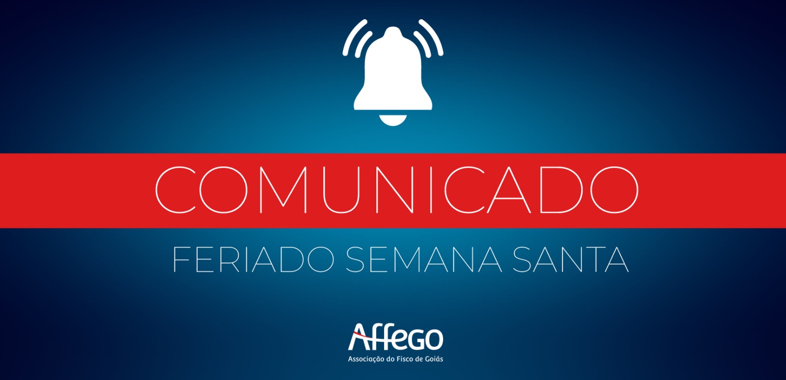 A Associação dos Funcionários do Fisco do Estado de Goiás (Affego) informa que, em razão do feriado da Semana Santa, não haverá expediente nos dias 17, 18 e 21 de abril.