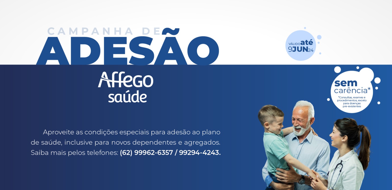 Para facilitar ainda mais, a Affego instituiu a Campanha de Adesão, com vigor até o dia 09/06/2024, dispensando o período de carência, salvo o caso de doenças preexistentes.