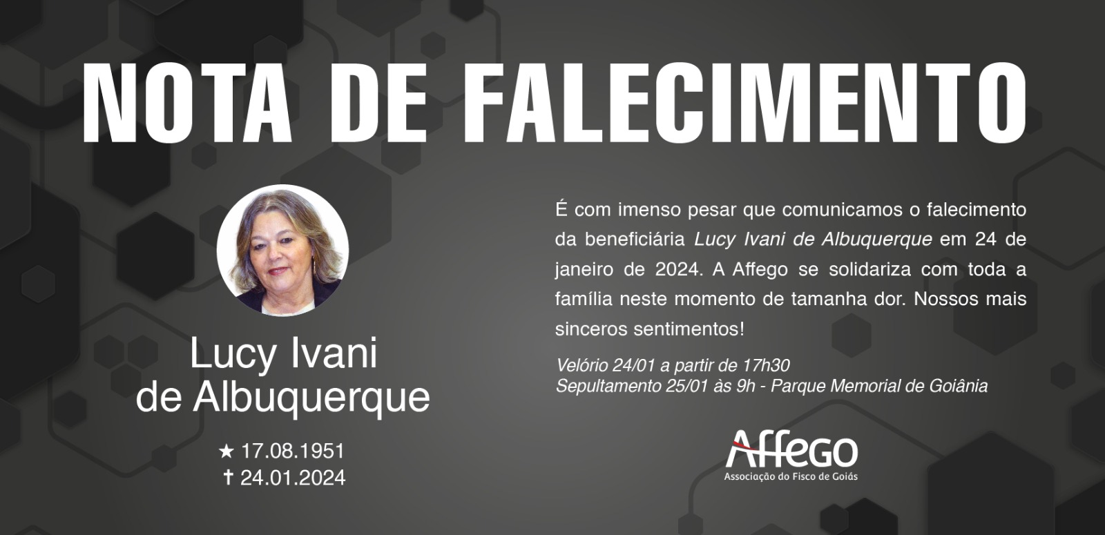 É com imenso pesar que comunicamos o falecimento da beneficiária Lucy Ivani de Albuquerque, em 24 de janeiro de 2024. A Affego se solidariza com toda a família neste momento de tamanha dor