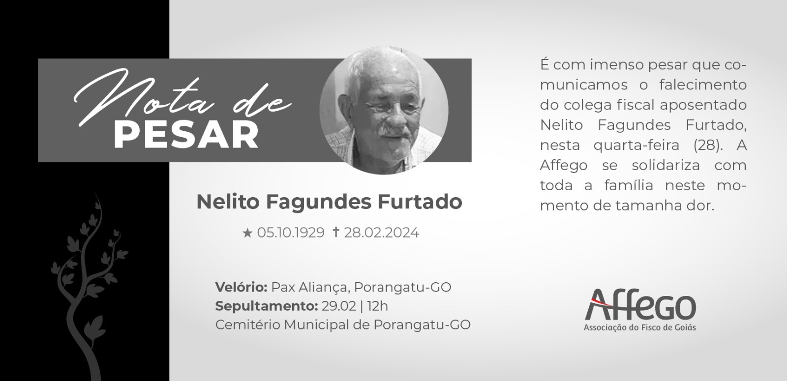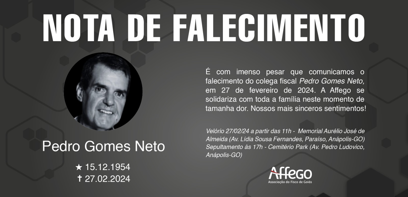 É com imenso pesar que comunicamos o falecimento do colega fiscal Pedro Gomes Neto, em 27 de fevereiro de 2024. A Affego se solidariza com toda a família neste momento de tamanha dor