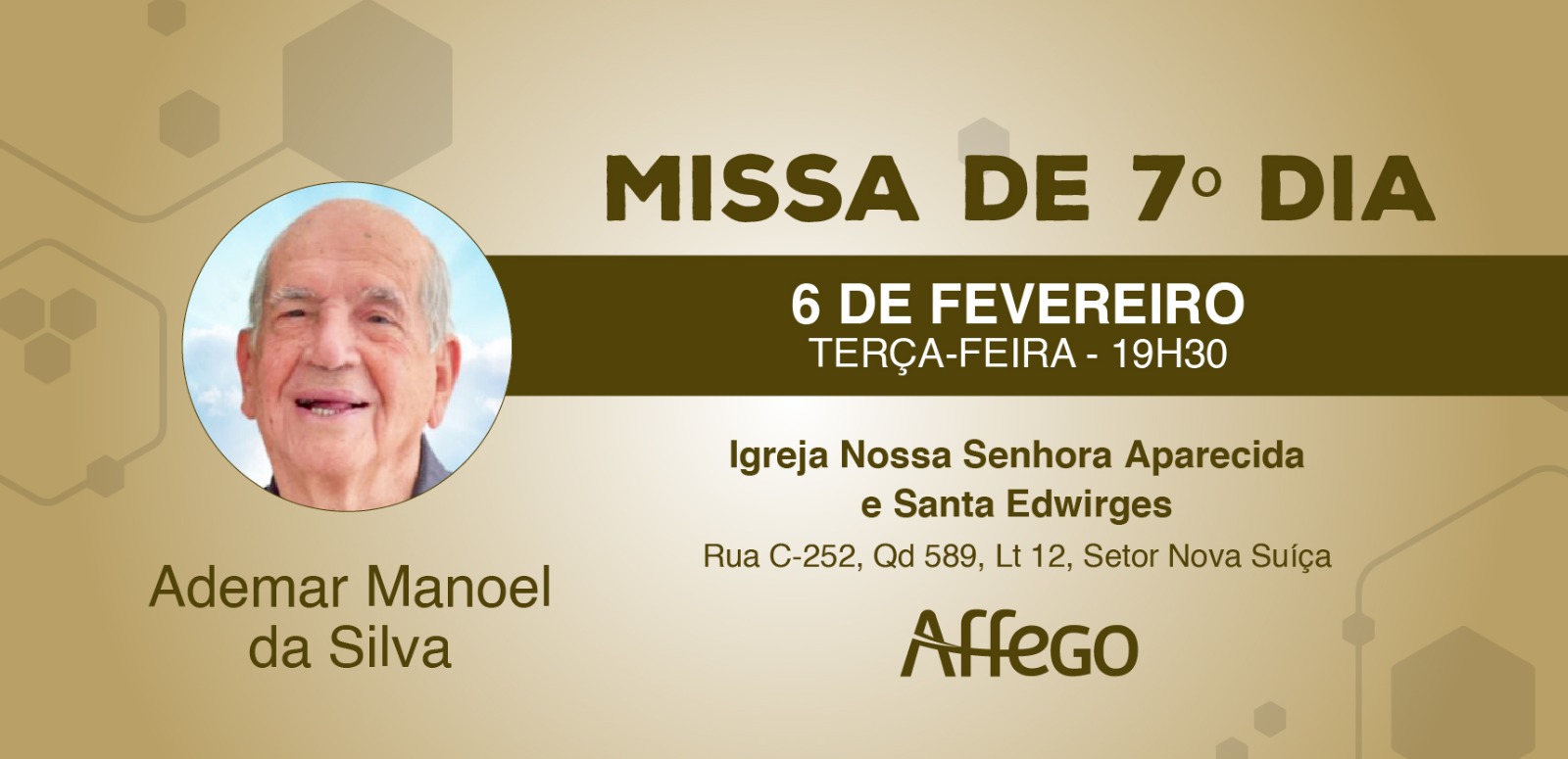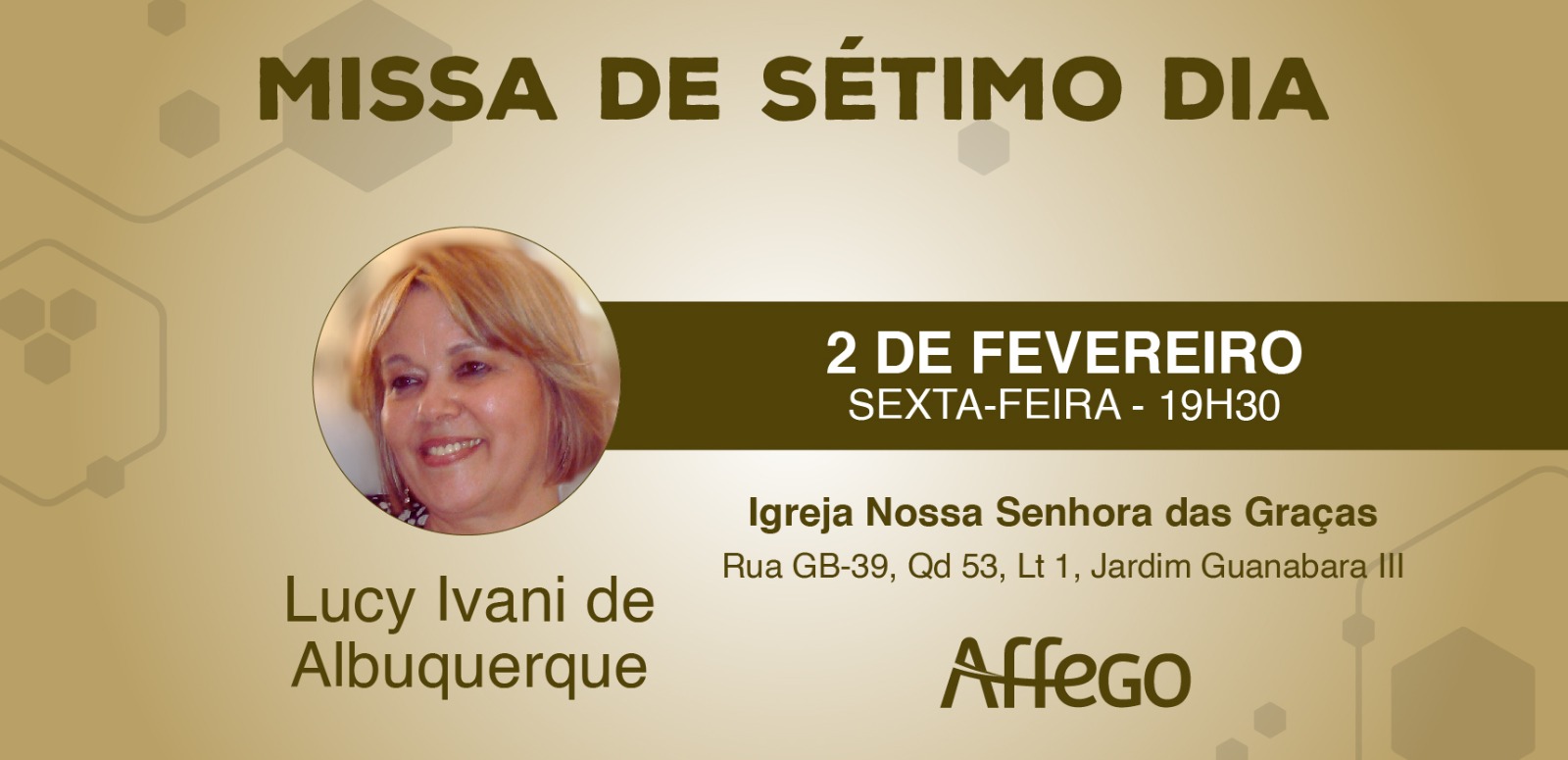 A missa será realizada no dia 02 de fevereiro, às 19h30, na Igreja Nossa Senhora das Graças, localizada na Rua GB-39 Qd.53, Lt 01, Jardim Guanabara III.