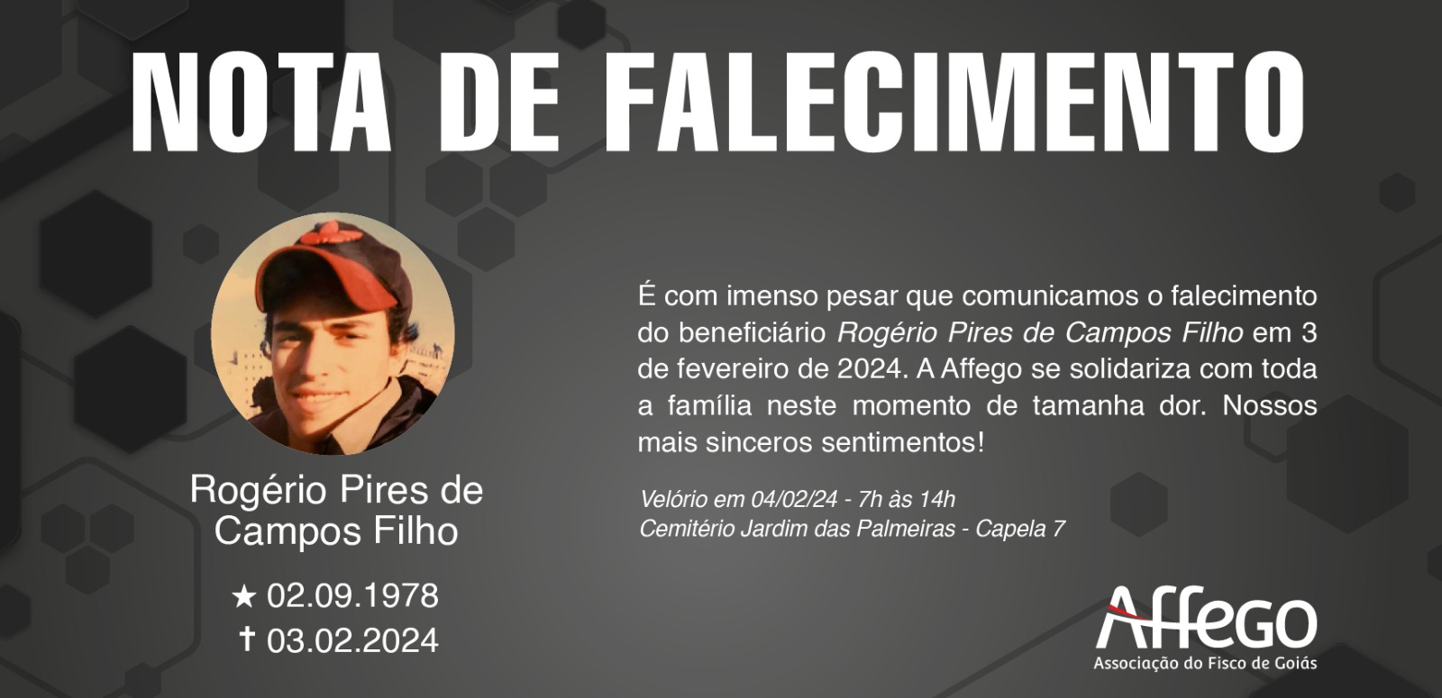 É com imenso pesar que comunicamos o falecimento do beneficiário Rogério Pires, em 03 de fevereiro de 2024. A Affego se solidariza com toda a família neste momento de tamanha dor.