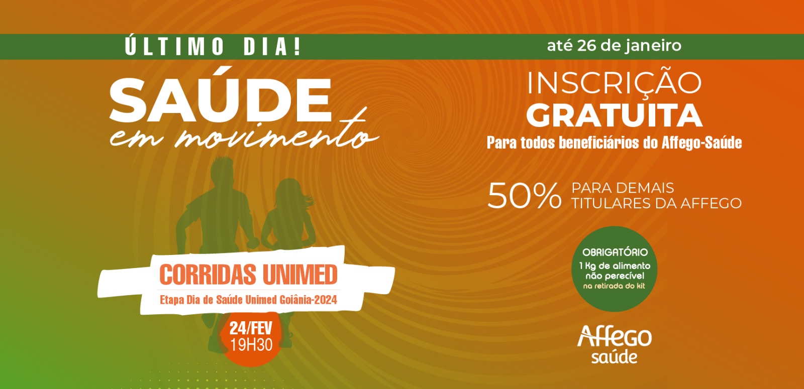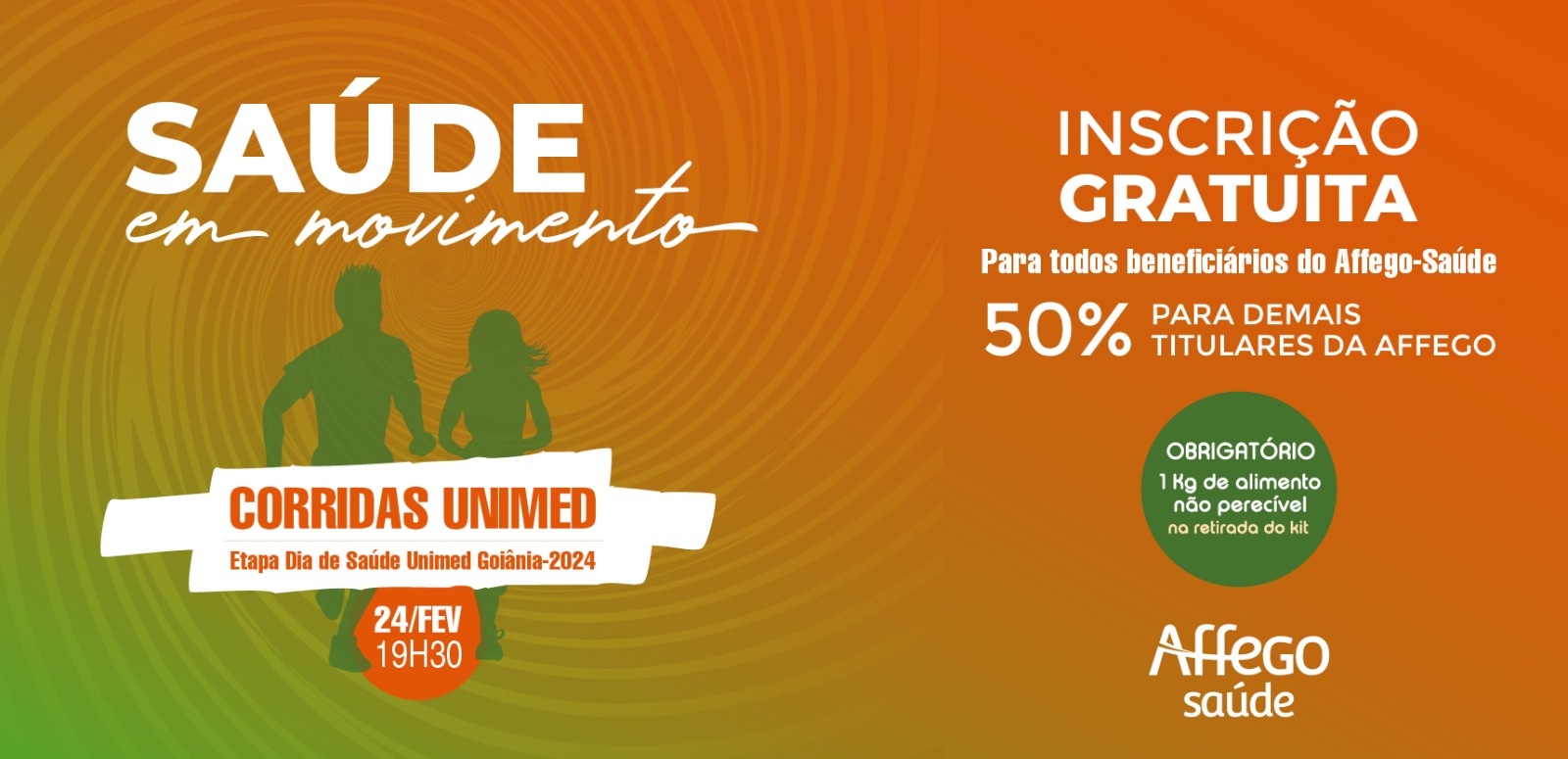 A AFFEGO, na programação denominada “Saúde em Movimento” no dia 24 de fevereiro, a partir das 19h, oferece aos associados a oportunidade de participarem da corrida realizada sob incentivos da UNIMED.
