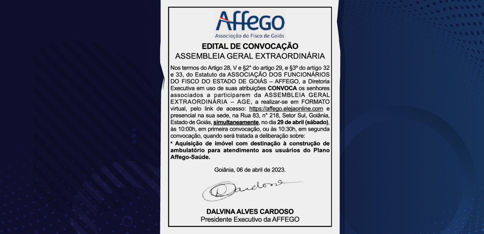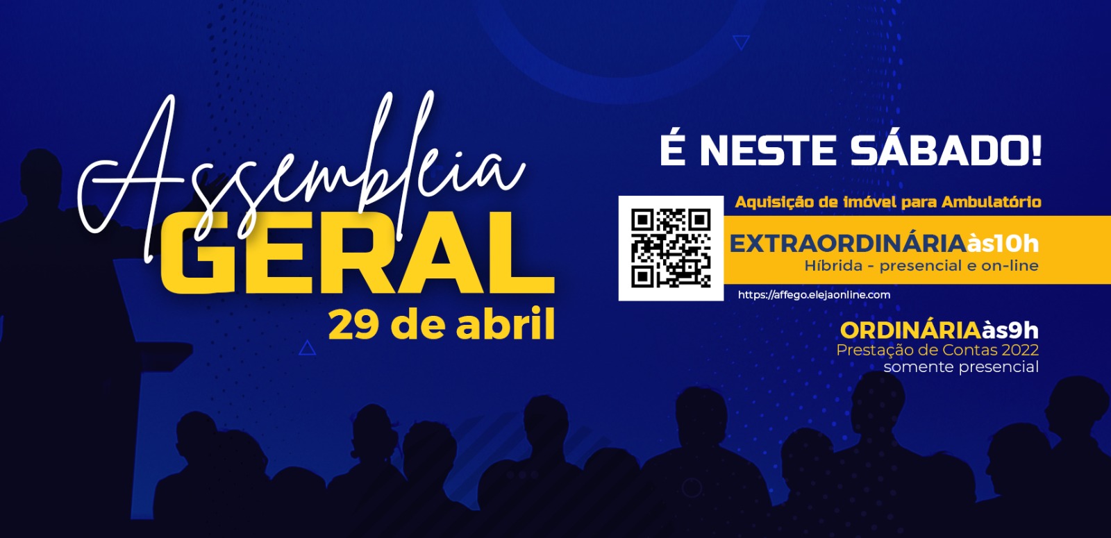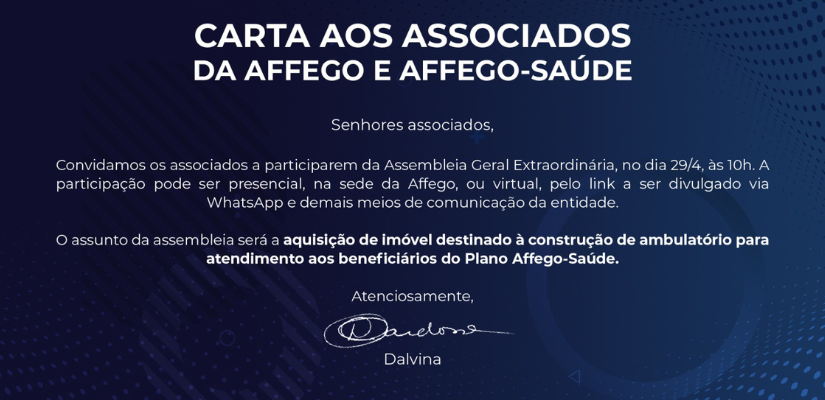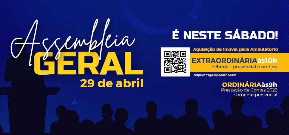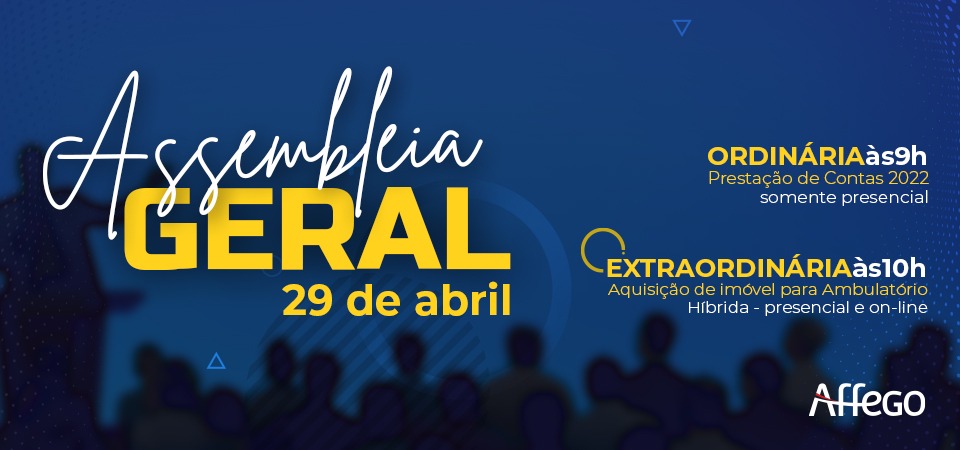 A Assembleia Geral Extraordinária acontece no dia 29 de abril, às 10h, com um assunto importante para o futuro da Affego e do Affego-Saúde: o novo ambulatório!